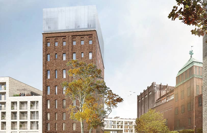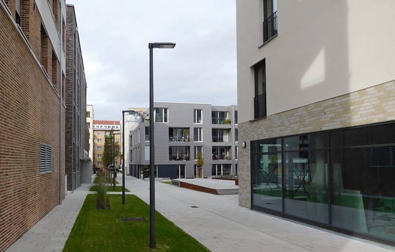 Das neue Wohnquartier lehnt sich an die Typologie des benachbarten Stadtteils „Auf der Prag“ an. Vier differenzierte Einzelgebäude liegen windmühlenartig an den äußeren Grundstücksgrenzen und spannen einen großzügigen Innenhof auf – ein wertvolles Stück Grün für alle Bewohner.